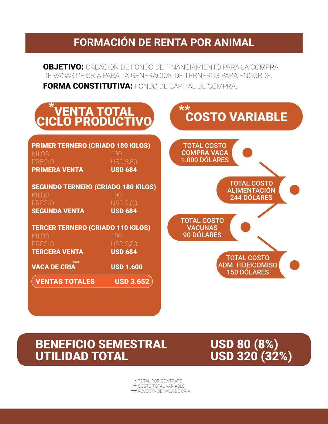 MODELO DE NEGOCIO VACA DE CRÍA: Compra de vacas de cría preñadas, cada una de las cuales, van a tener su primera parición a los 3 meses de la compra. A su vez, cuando nace el ternero se recría en base a pastura natural con posibilidad de darle un alimento en base a avena y/o maíz picado de planta en invierno hasta llegar a los 220 kilos y allí se vende el mismo al mercado. El negocio prevé 3 pariciones a lo largo de la vida del proyecto, la venta de 2 terneros recriados de 220 kilos cada uno, y la venta residual de esa vaca de cría con un ternero al pie de 110 kilos.